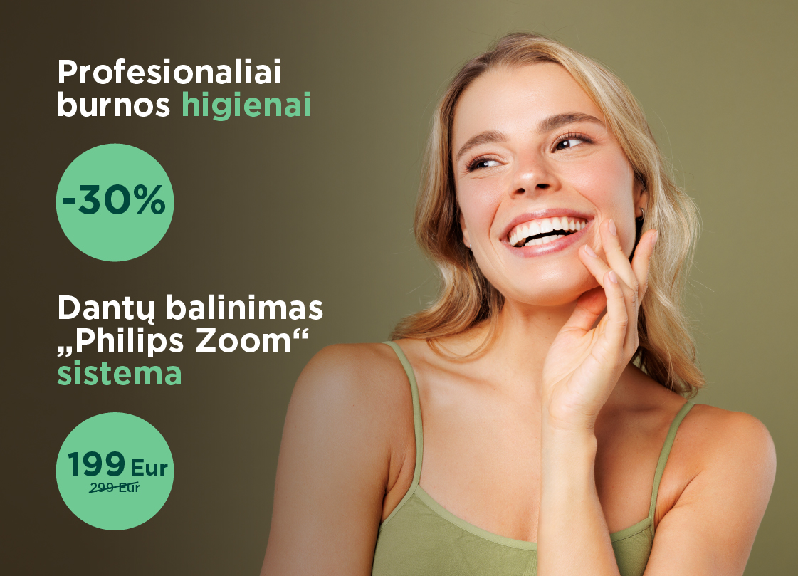 - profesionaliai burnos higienai su sodapūte (Air-flow metodas);